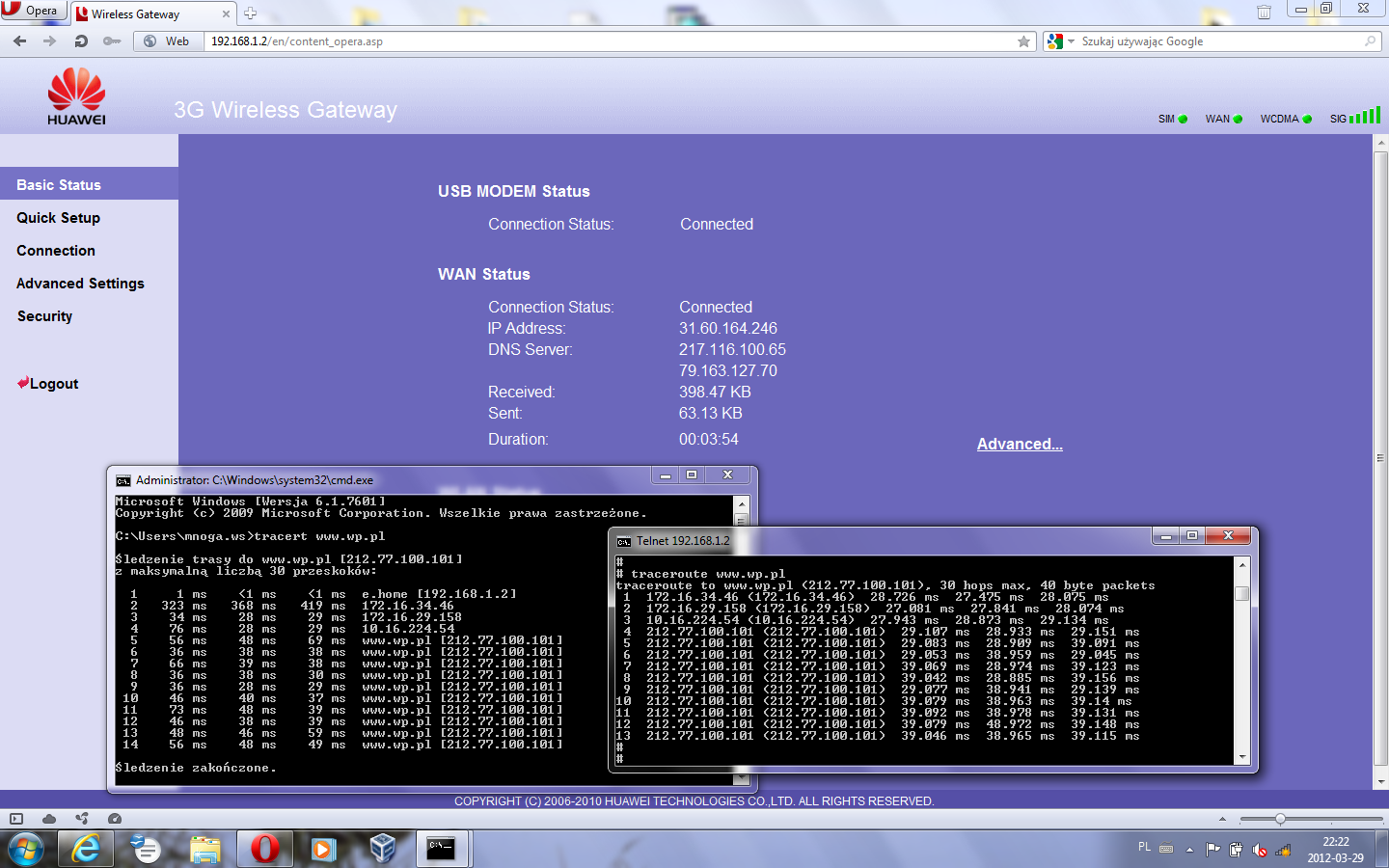 Z modemem HSPA+ (E1820) sieć zachowuję się mniej stabilnie, większe pingi i po chwili nieaktywności, modem przechodzi w czyste 3G (z wielkimi pingami),